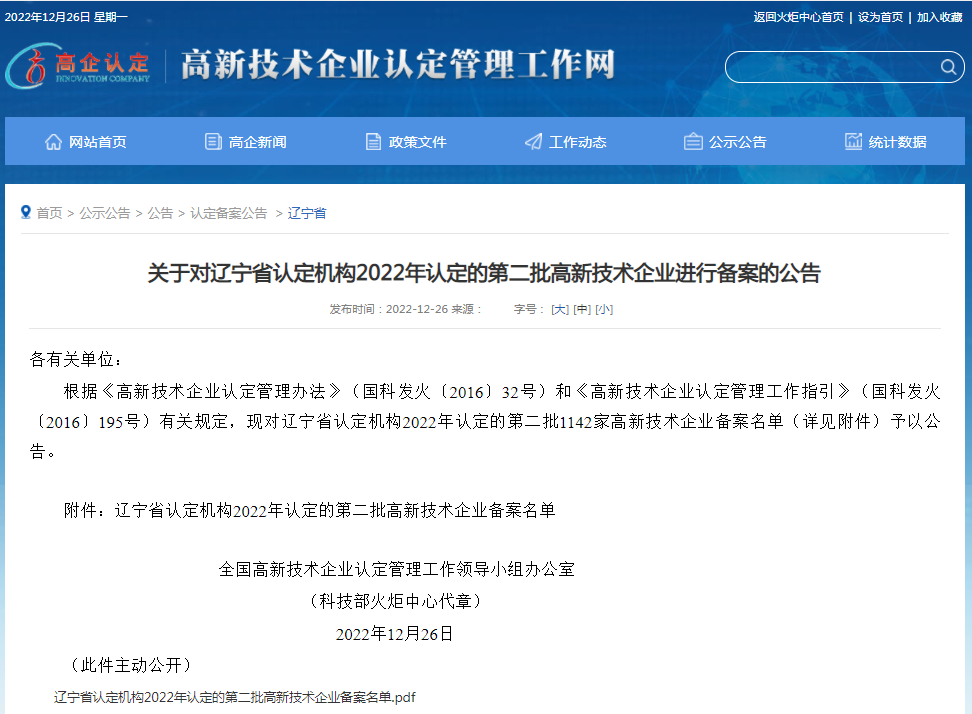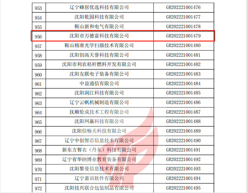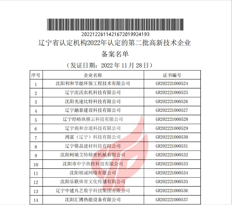 2022年12月26日,全國高新技術(shù)企業(yè)認定管理工作領(lǐng)導(dǎo)小組辦公室正式發(fā)函,公布了遼寧省2022年認定的第二批高新技術(shù)企業(yè)備案名單。沈陽市萬德富科技有限公司成功通過國家高新技術(shù)企業(yè)認定。